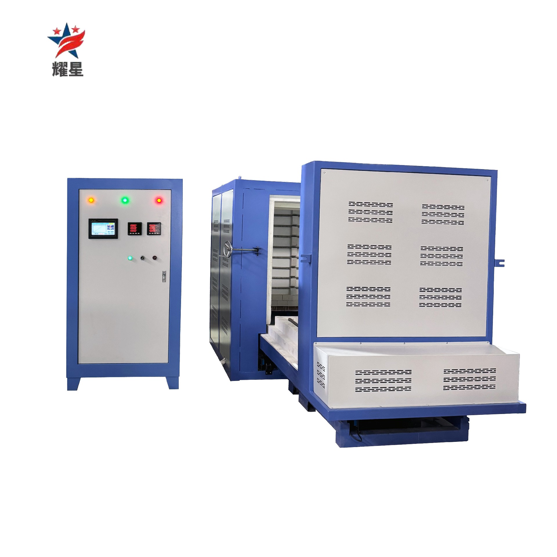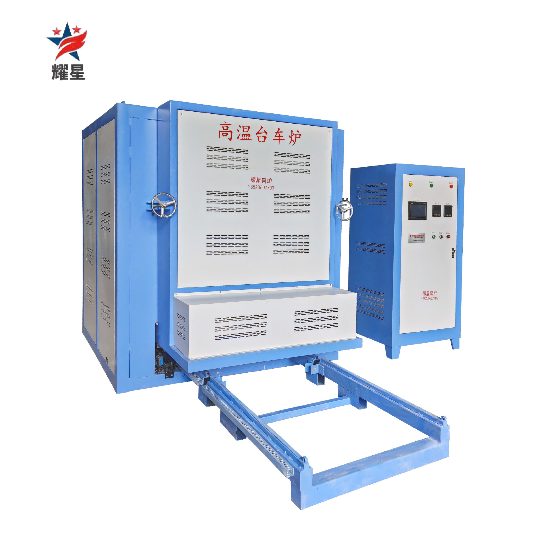 高温台车炉为长方箱形结构,承重平台为可移动小车,工件堆放在工作台上,进出电动推车传动,炉门上下开关,电动控制,炉衬采用轻质氧化铝纤维板拼装而成的炉体炉底采用轻质保温砖和重质可承重耐火砖砌筑,加热元件采用电阳丝和电阻带加热;砗碳棒,砖钼棒,炉体外壳采用钢板和型钢制作,炉门、台车采用机械传动;具体配置按客户和炉温要求设计配备。