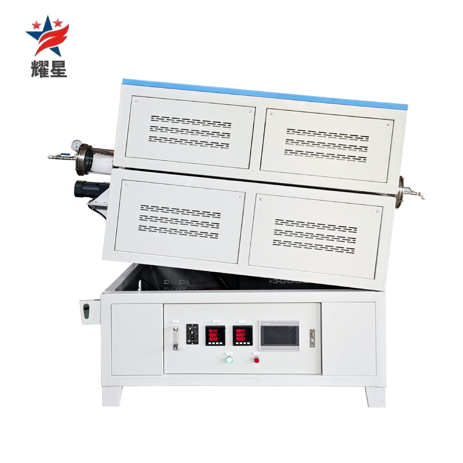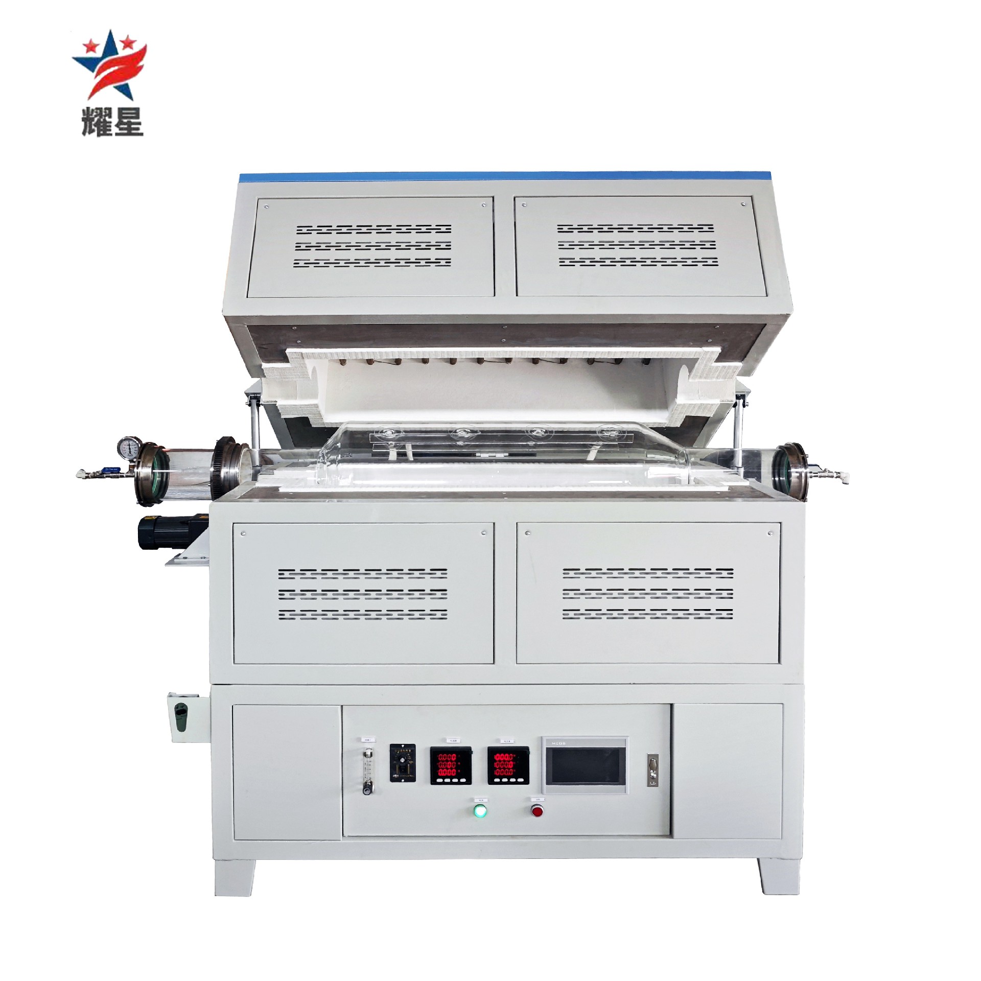 洛阳耀星此款电炉的设计为可调性倾斜角度,由电动支撑调节角度(整个炉体的重量来选择电动)通过调节倾斜节度来调节出料速度。炉管传动安装在进口处,由齿轮、减速机、电机,变频器构成一个传动系统,来带动炉管的旋转,旋转的速度可以调节。装有360度旋转接头,无需人工调整气管。采用法兰连接,减少了加热管损坏的可能,取、放物料更加方便快捷。选配可选择采用触摸屏控制、实时追踪、历史记录、输出报表等功能;具有开启断电,超温报警,漏电保护等安全操作功能。